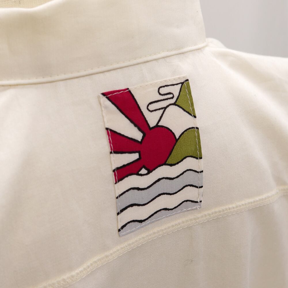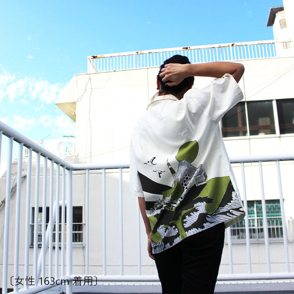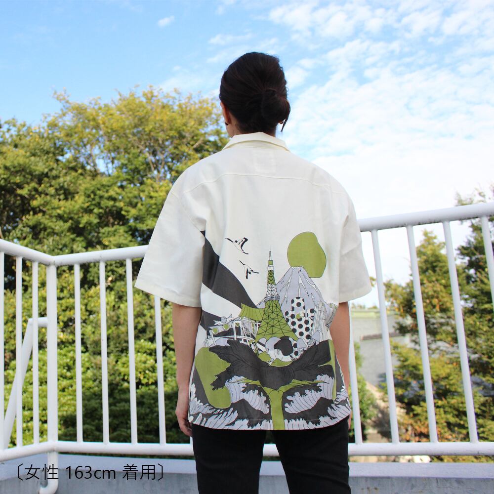 浮世絵に見られる線の表現を使った人や建物、風景を背面に大きくあしらった繊細かつ大胆なデザイン。ブランドロゴは内側のタグ部分にワンポイントとしてプリントされています。前面には両胸にポケットがついたデザインとなっており、シンプルながらアクセントとなっております。