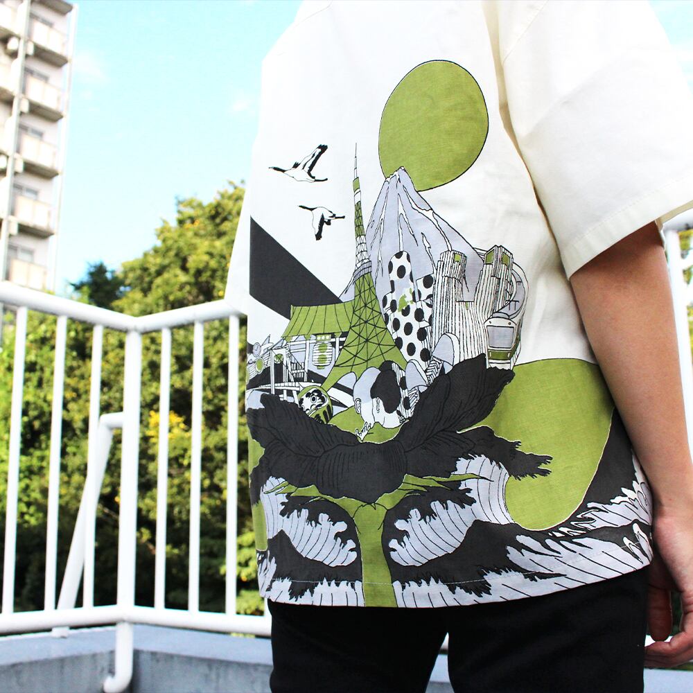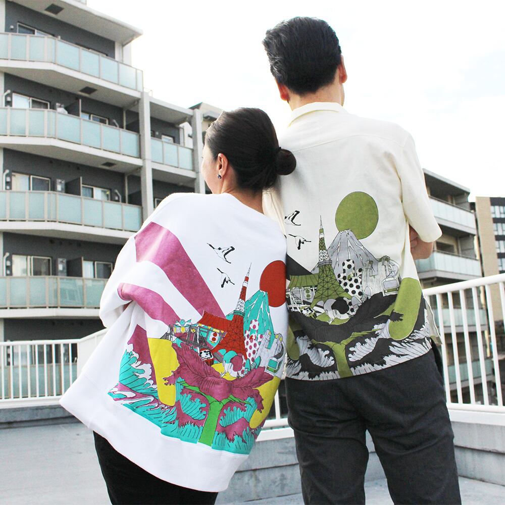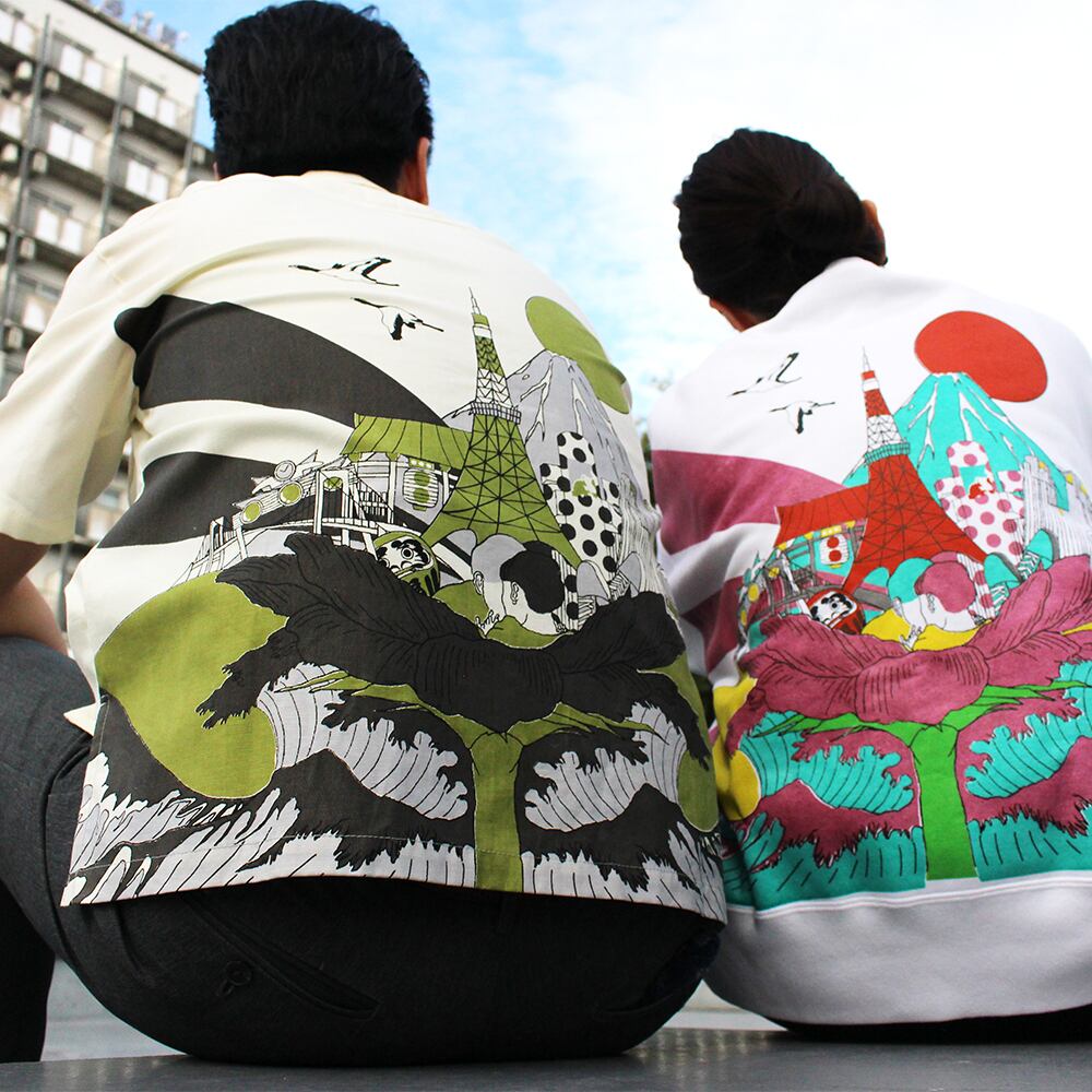 東京という街は華やかな人や物、建物等に溢れまさに華の街です。私は地方都市から上京し、その華やかさに魅了され大きく影響を受けました。そのような東京で見た景色や思いを図案と配色として製品に詰め込み、沢山の人々に届けたいと考えています。縁取りの線や風景のデザインは江戸時代に発達した浮世絵に使われる表現を参考にしており、現代的なファッションスタイルにも使用していただくことができる温故知新的要素を持ったアイテムとなっております。
