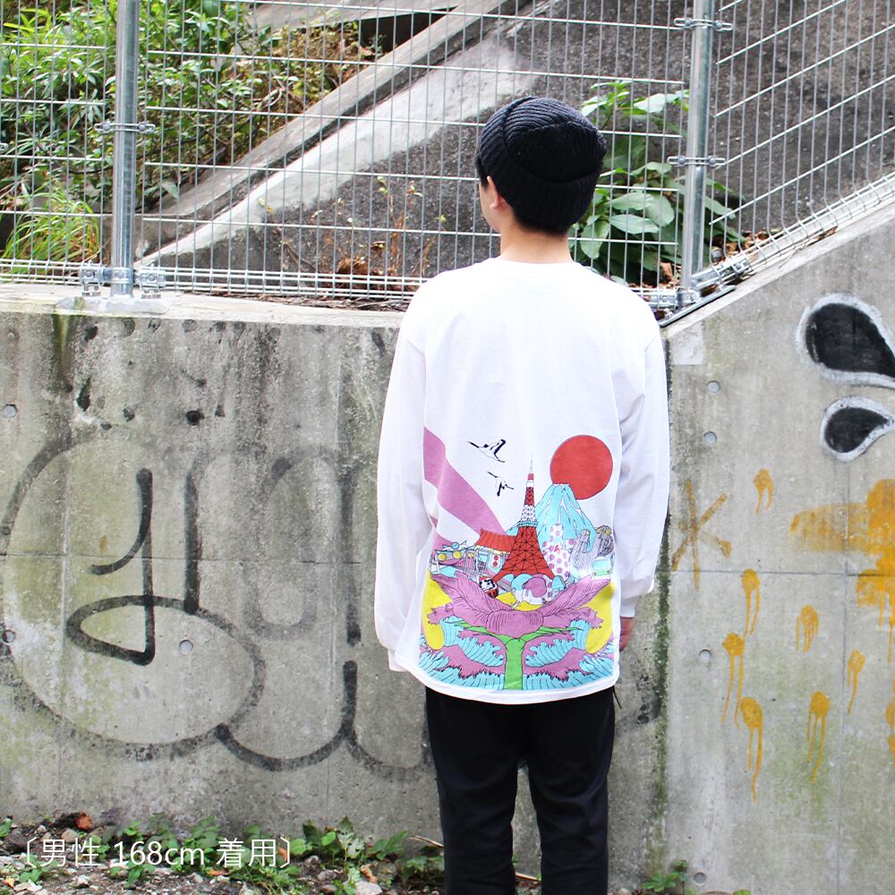 浮世絵に見られる線の表現を使った人や建物、風景を背面に大きくあしらった繊細かつ大胆なデザイン。ブランドロゴは背面デザインと同配色で前面にワンポイントとしてプリントされておりアクセントとなっています。