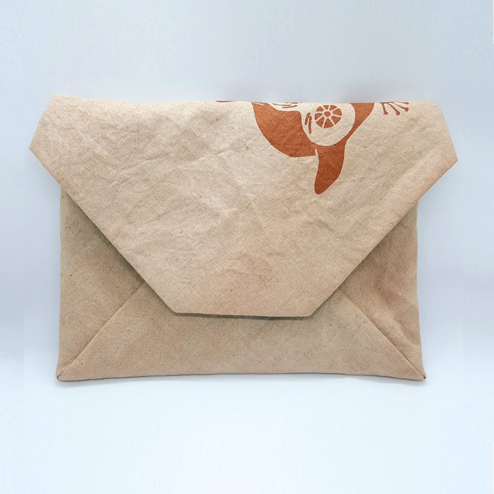 日本の伝統的な染料である柿渋を、シルクスクリーンプリントを使いモダンな雰囲気を取り入れた数寄屋袋を制作しました。東南アジアの島々に生息するメガネザルのモチーフを柿渋でプリントし、その後布全体を柿渋で染めました。金属による媒染はせず、柿渋本来の柔らかな色合いに仕上げています。