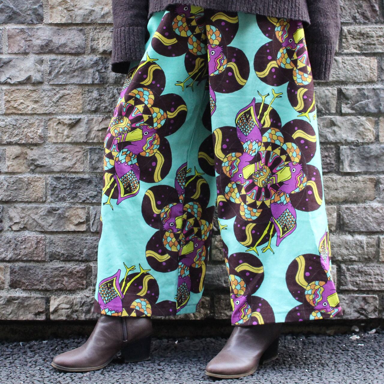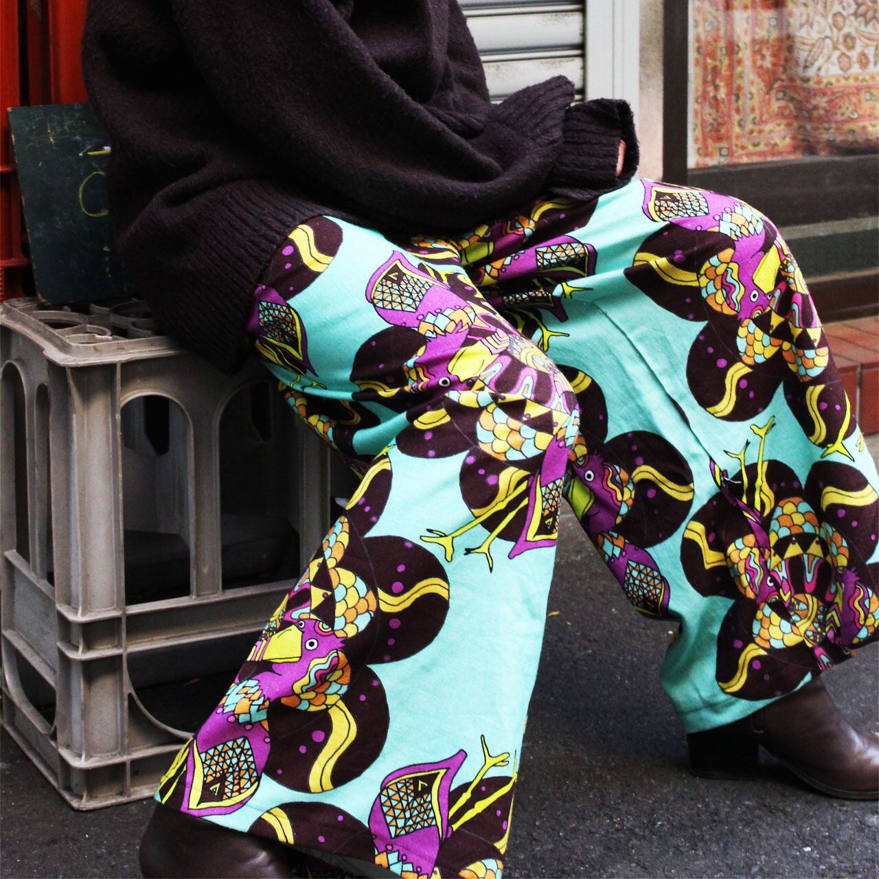 履いたすべての人が笑顔になれるように心をこめてかわいいハシビロコウモチーフのエスニックヨガパンツを作りました。