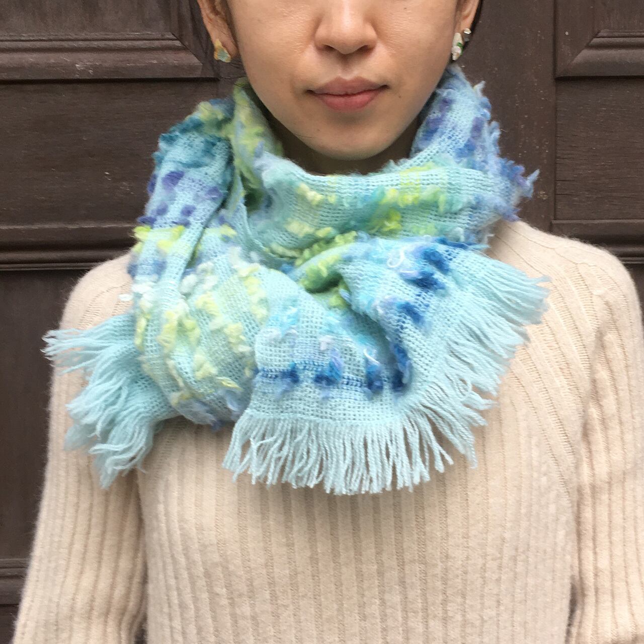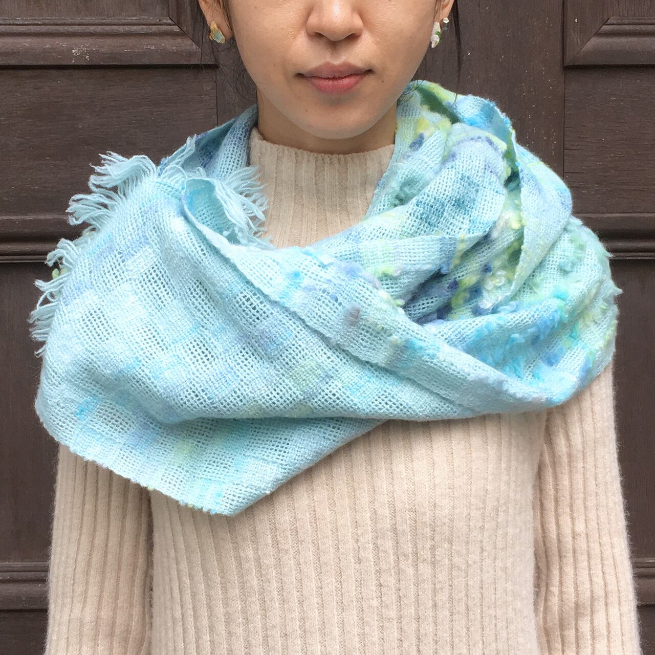 厳冬期に蕾を膨らませる梅と、早春に芽吹いた新緑をイメージした連作マフラー。