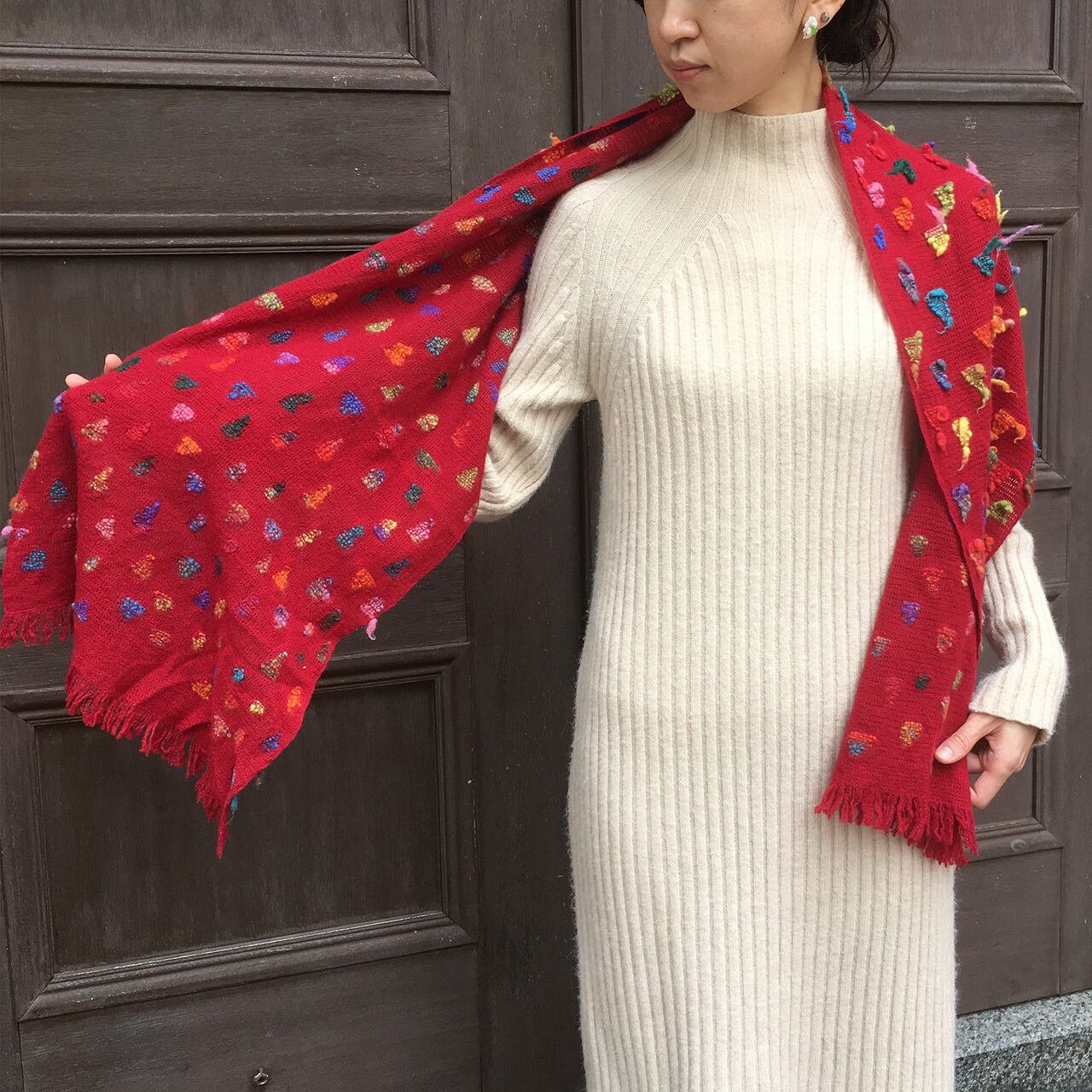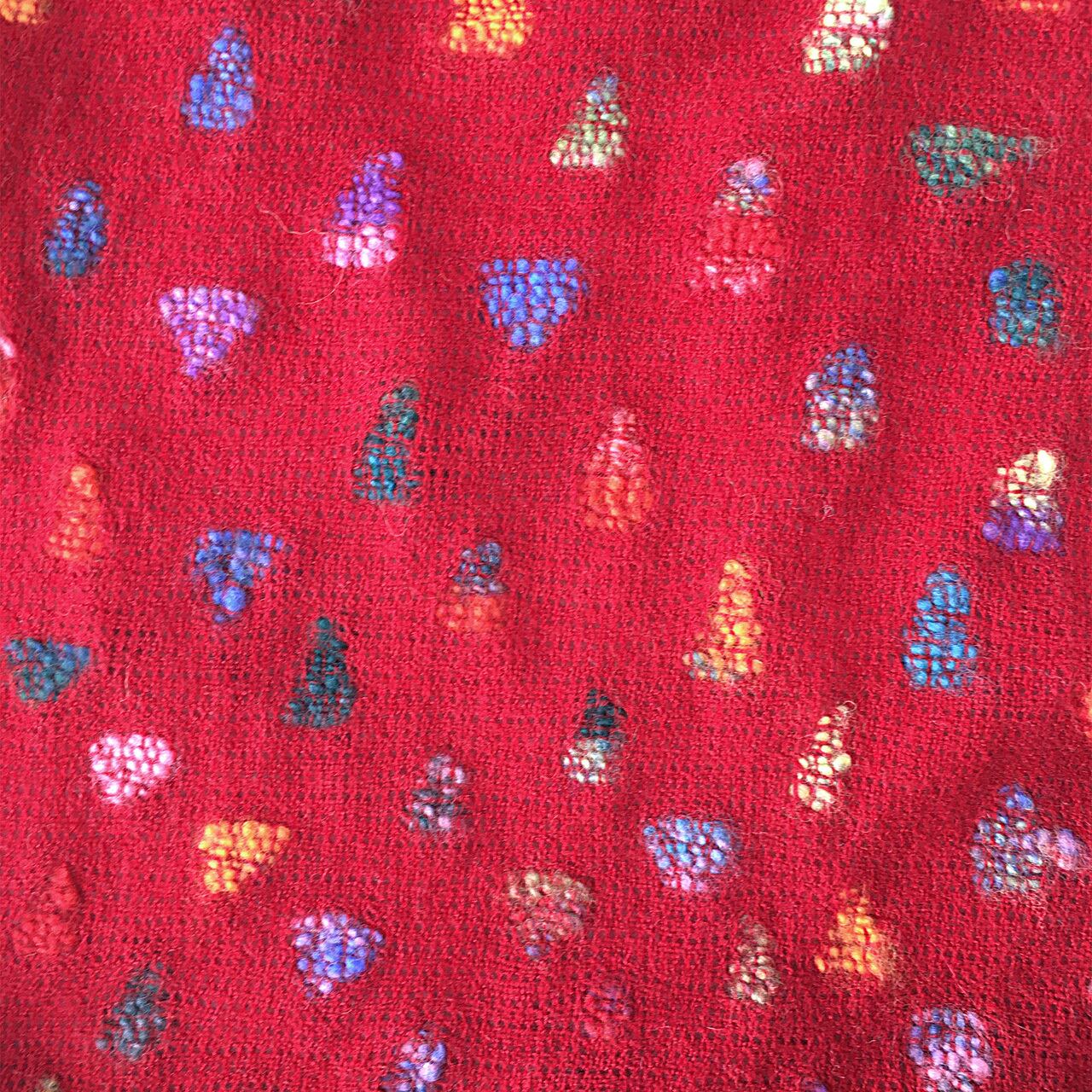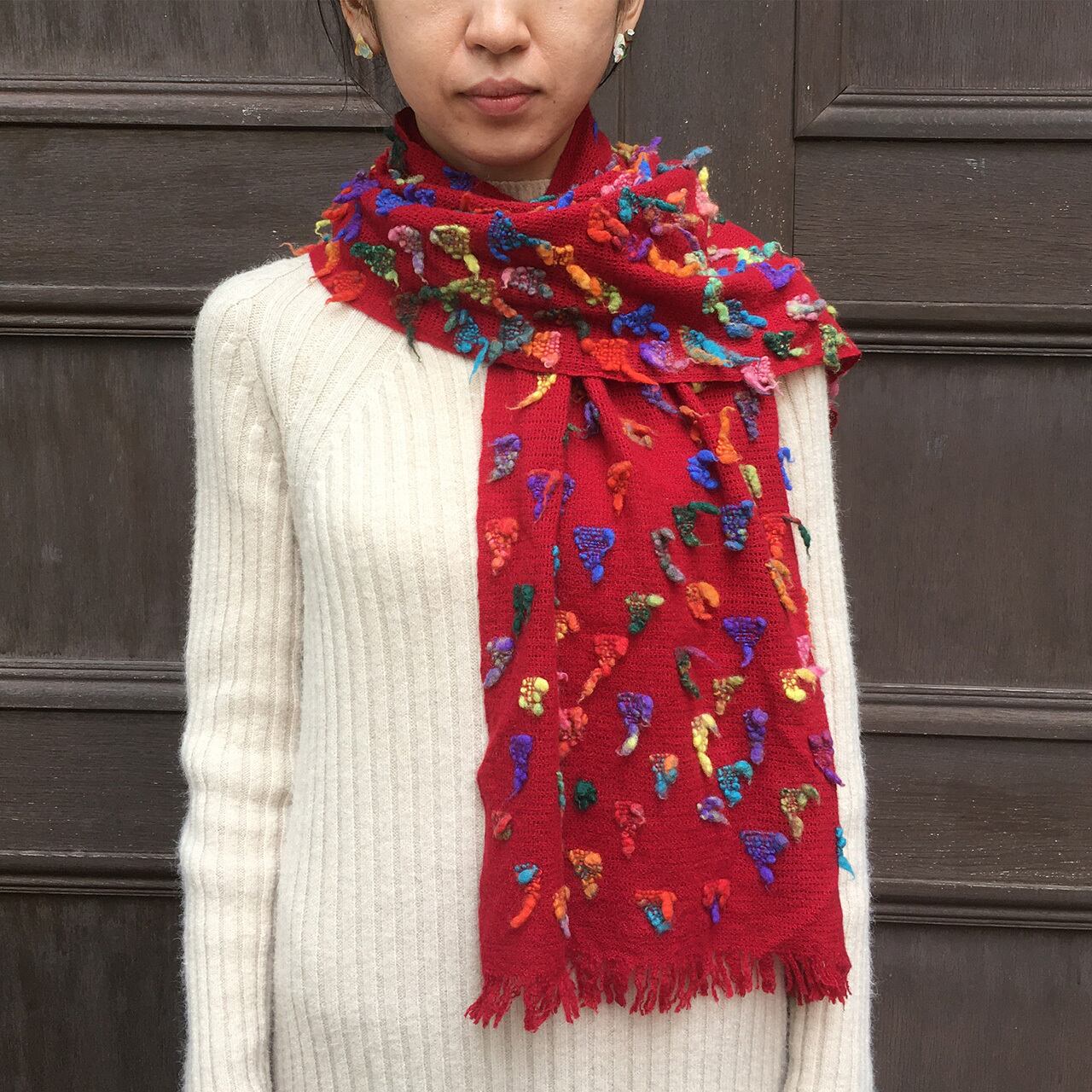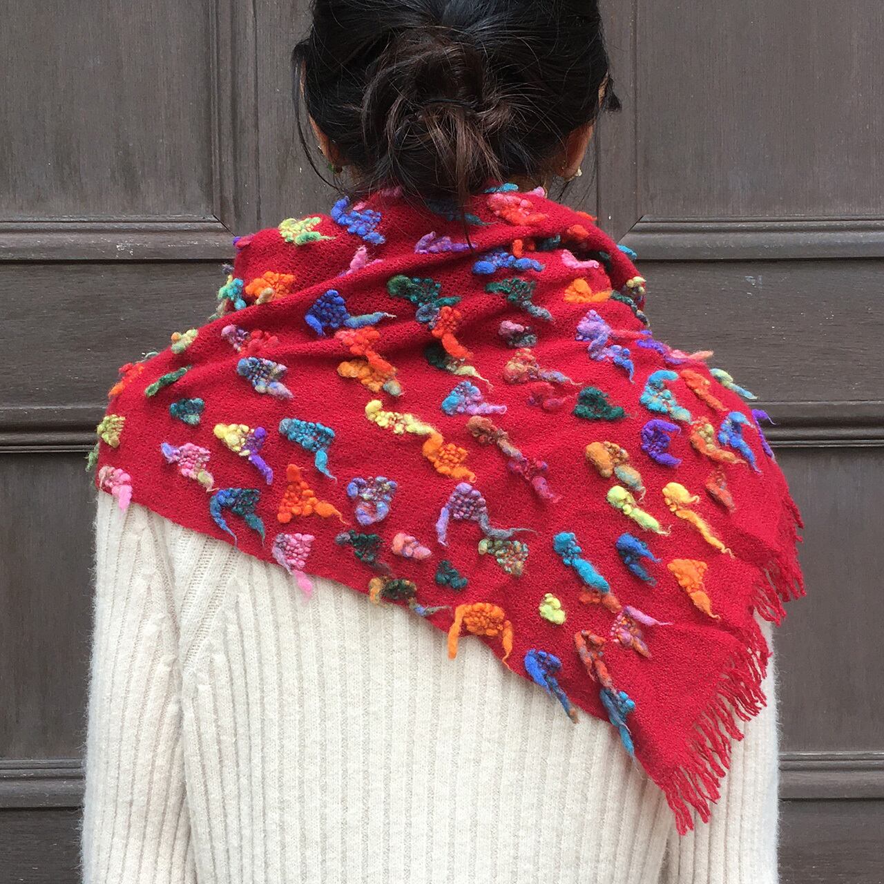 緩く紡いだカラフルなウール糸をフェルト化し、一面は角のような突起で動きを与え、一面はドット模様にしました。