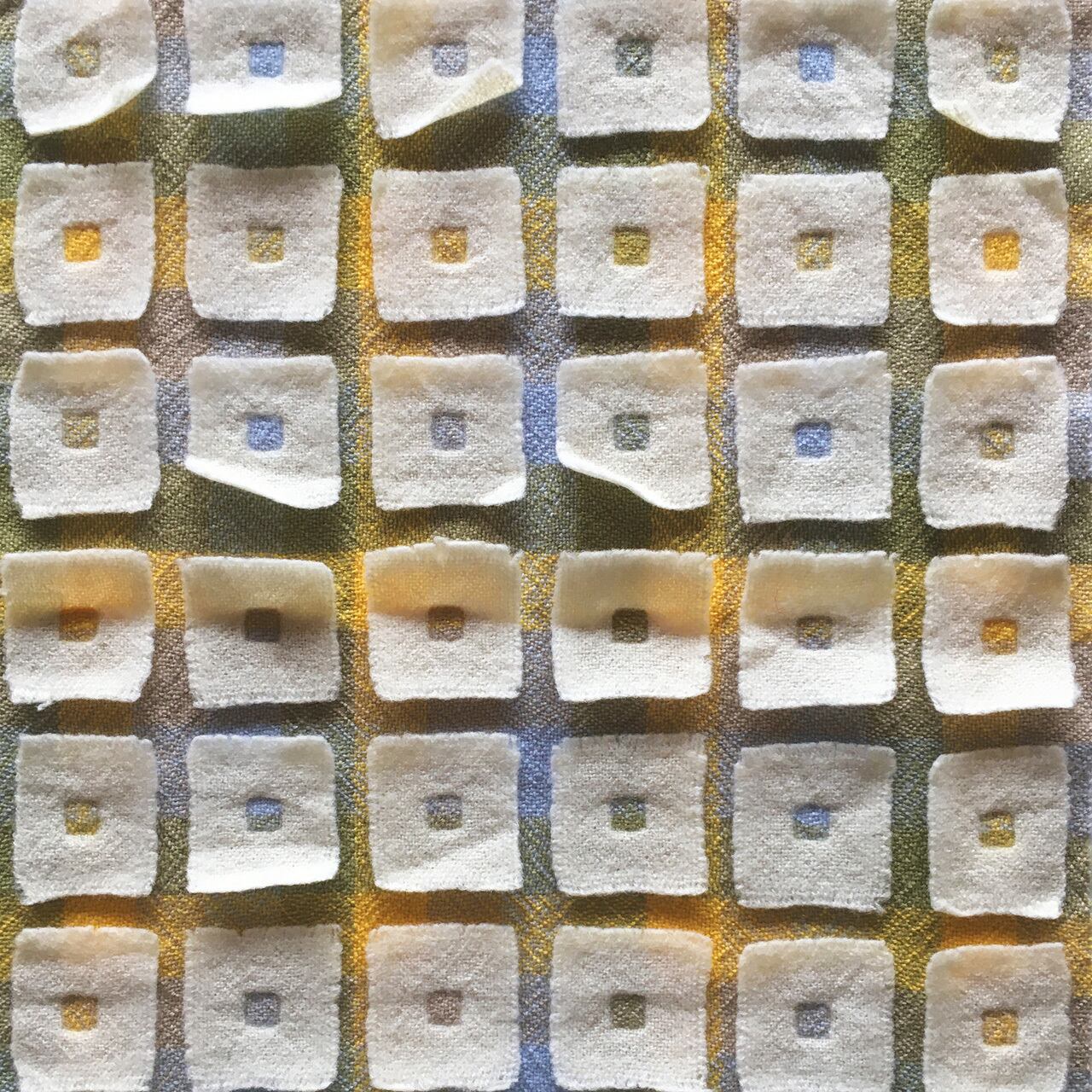 たくさんの付箋がメッセージボードに張ってあるようなテキスタイル。