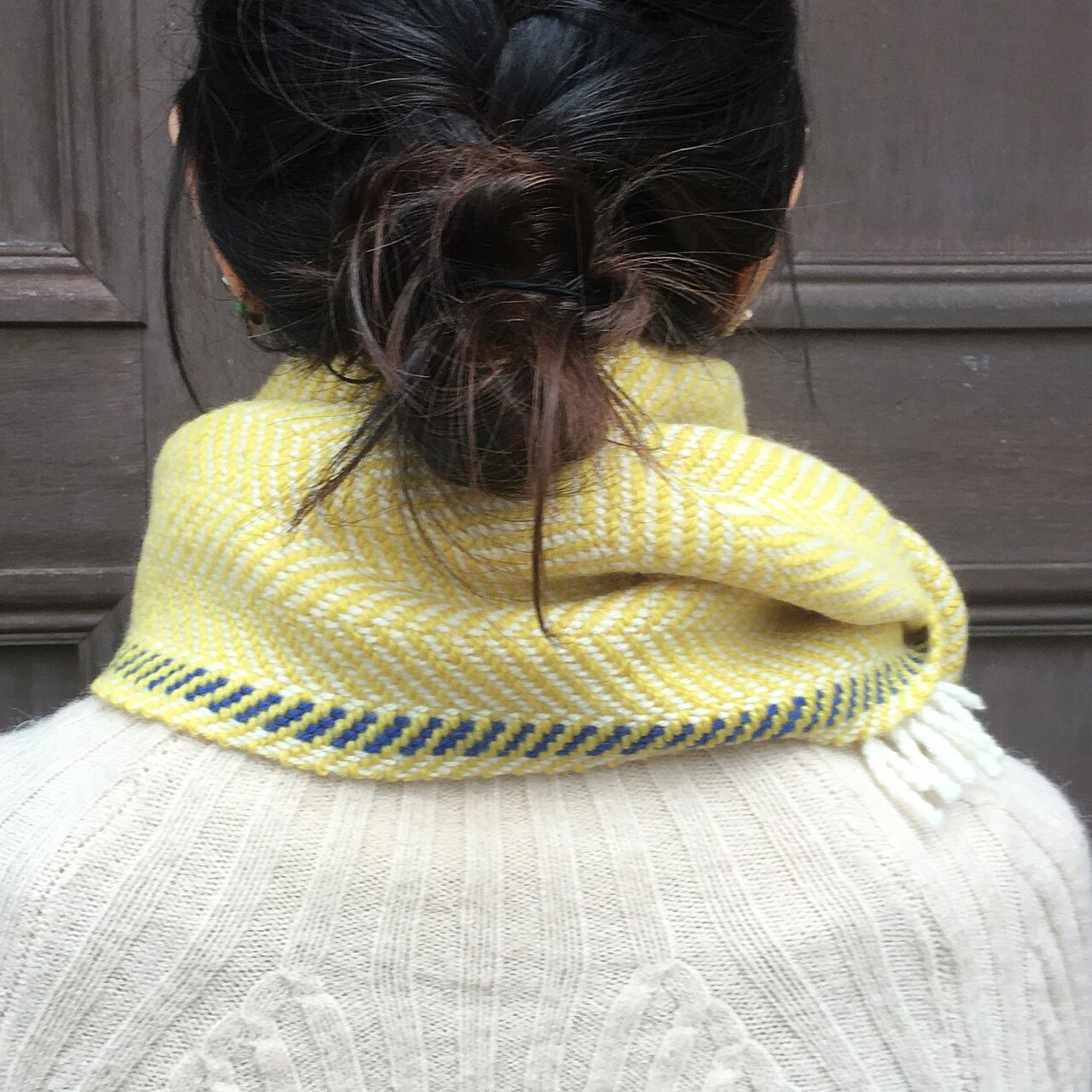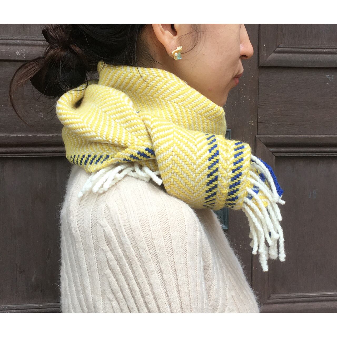 経糸は白、両サイドに紺色のラインを効かせ、緯糸は爽やかな黄金色。