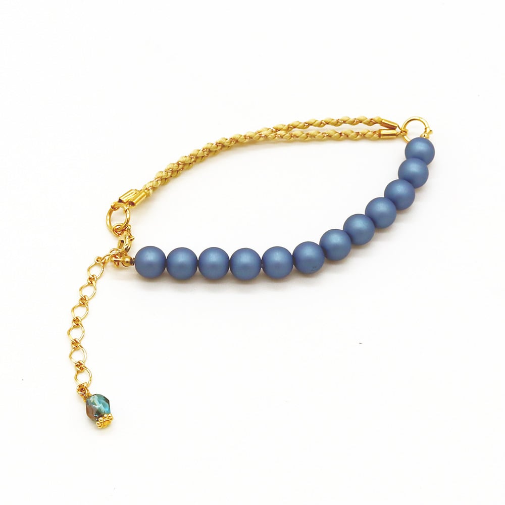くすんだ薄青の樹脂パールをつなげた和風のブレスレットです。パールの反対側にはベージュの糸&茶金の糸の細い組紐をつけて、落ち着きの中にも少し豪華な印象が出るように仕上げました。長さ調節が可能で、チェーンの先の透明なアクアブルーのクリスタルビーズが手首で軽やかに揺れてかわいいです。和服洋服どちらにでも合わせられるブレスレットです。