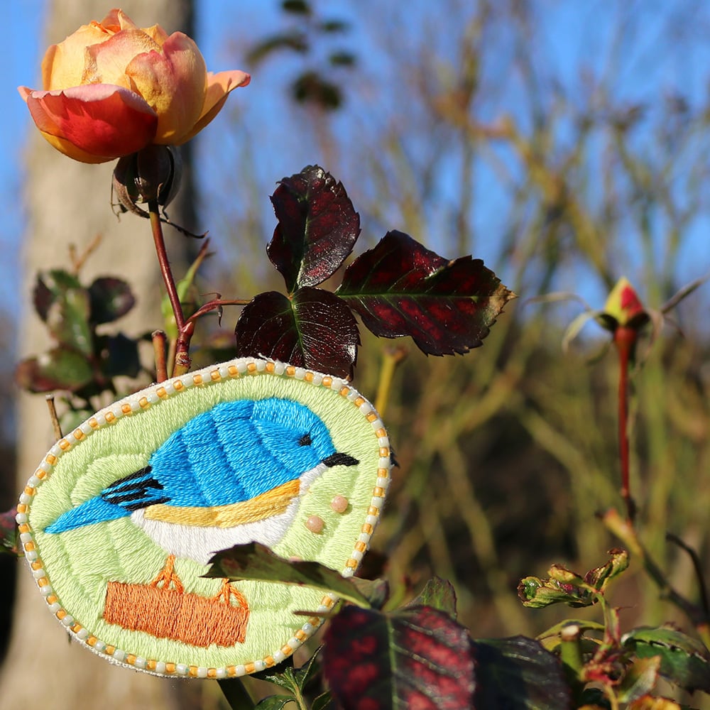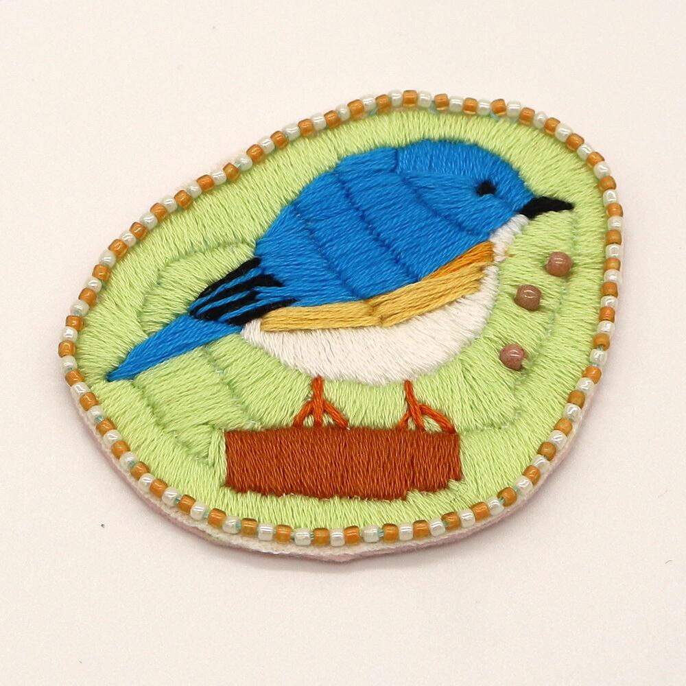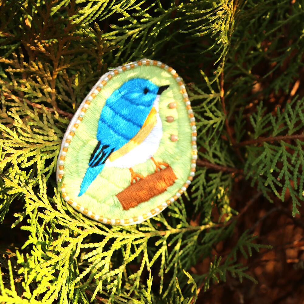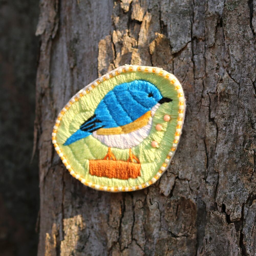 瑠璃色の野鳥「ルリビタキ」を刺繍してバッジをつくりました。幸福の青い鳥とも呼ばれています。