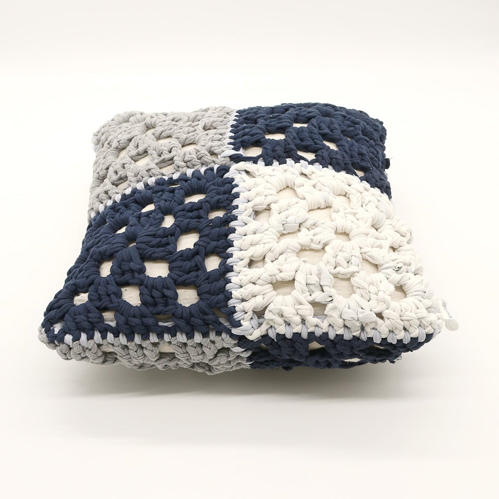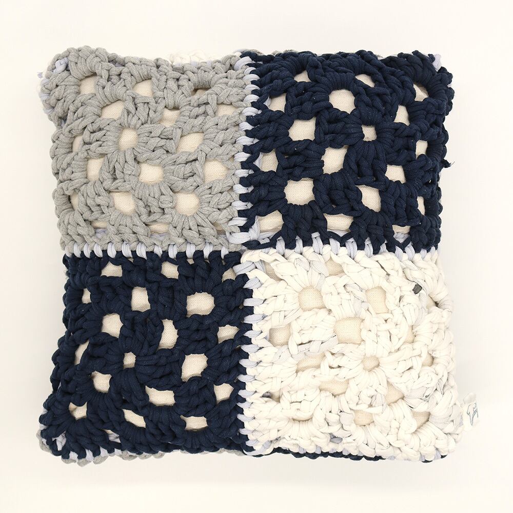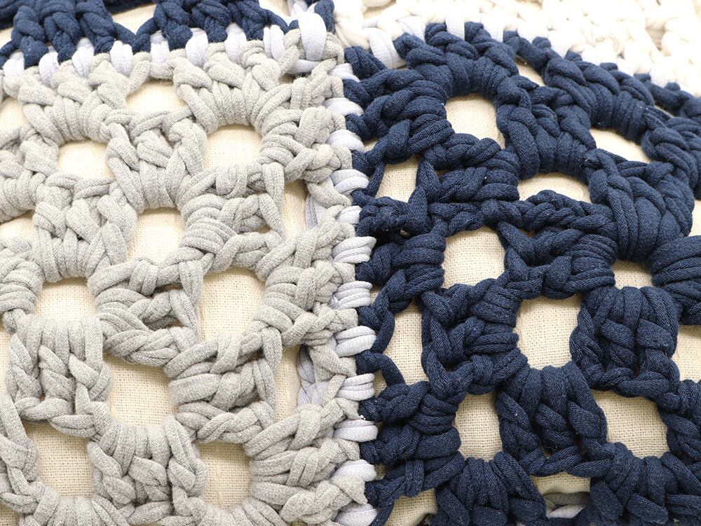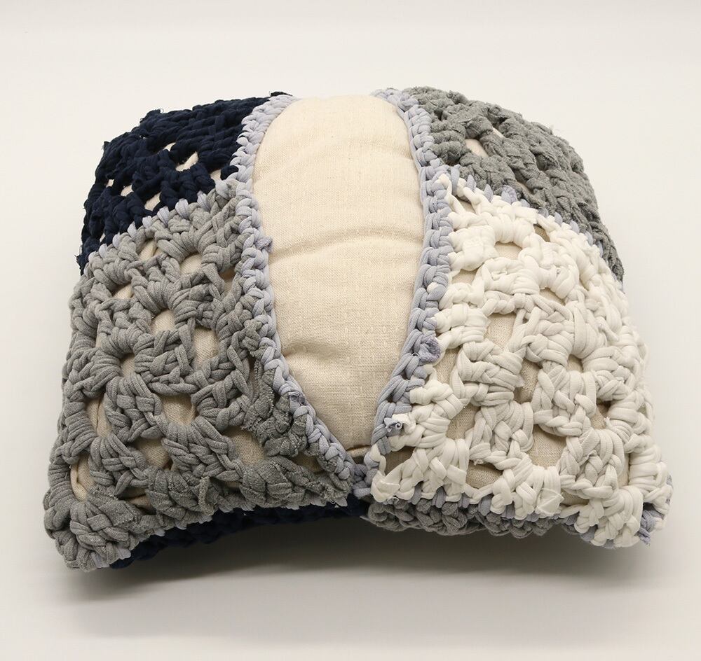古着のTシャツを細く裁断し、かぎ針を使って編んだクッションカバー。